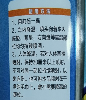 2、在使用清凉喷雾时,不要直接对着皮肤喷,不要在易燃易爆环境下使用,一定要远离明火。