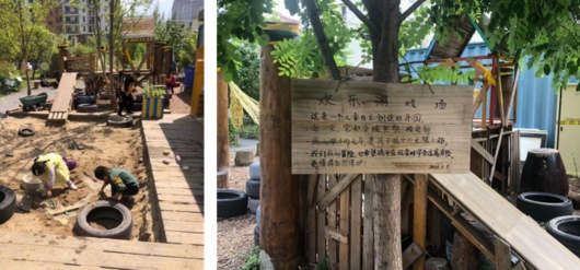 儿童游戏场靠近农园中央。这里设置了沙坑和树皮活动区,沙坑一侧还有滑梯装置。