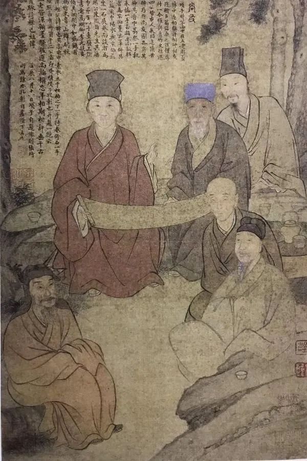 ▲ 张琦 项圣谟《赏友图》(图中持画红衣者为董其昌,持画蓝帽者为松江陈继儒)