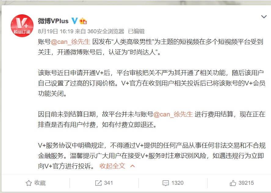 8月19日下午,官方账号@微博VPlus发动态称,该账号(@can_徐先生)近日申请开通V+后,平台审核把关不严,为其开通了相关功能,随后该用户自己设置了过高的订阅价格。
