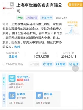 记者在天眼查搜索发现,以“徐勤根”为企业法人或高管的公司中,符合金融、外汇等服务范畴、仍在存续的只有一家公司,名为上海亨世商务咨询有限公司。该公司注册资本为10万元,成立于2016年,徐勤根担任企业法人及执行董事。此“徐勤根”是否就是网上走红的徐勤根,尚有待确认。