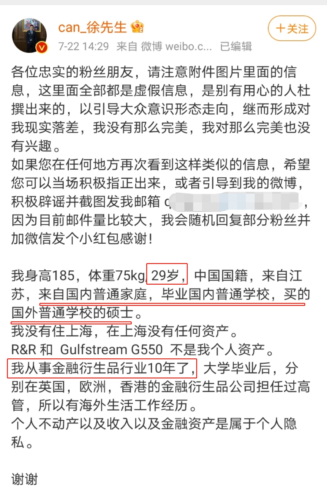 不过,徐勤根在微博上否认了该传言,并给出一段关于他本人的信息:今年29岁,已从事金融衍生品行业10年,大学毕业后在英国、欧洲的金融衍生品公司担任过高管。
