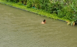从村民拍摄的现场视频可以看到,男子独自在河里缓缓游动,仿佛丝毫不在意岸上村民的围观。