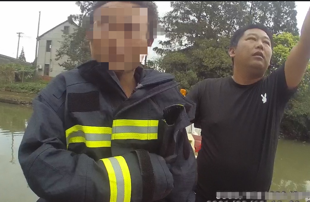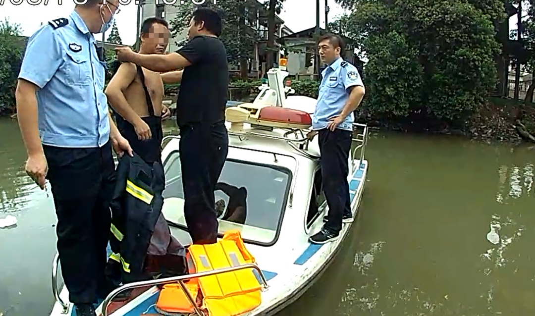 民警立即脱下制服为该男子披上,将其救上船,并劝散了围观村民。待男子安全上岸后,消防队员也将衣服脱下给他,并找来拖鞋、裤子等让他包裹身体。