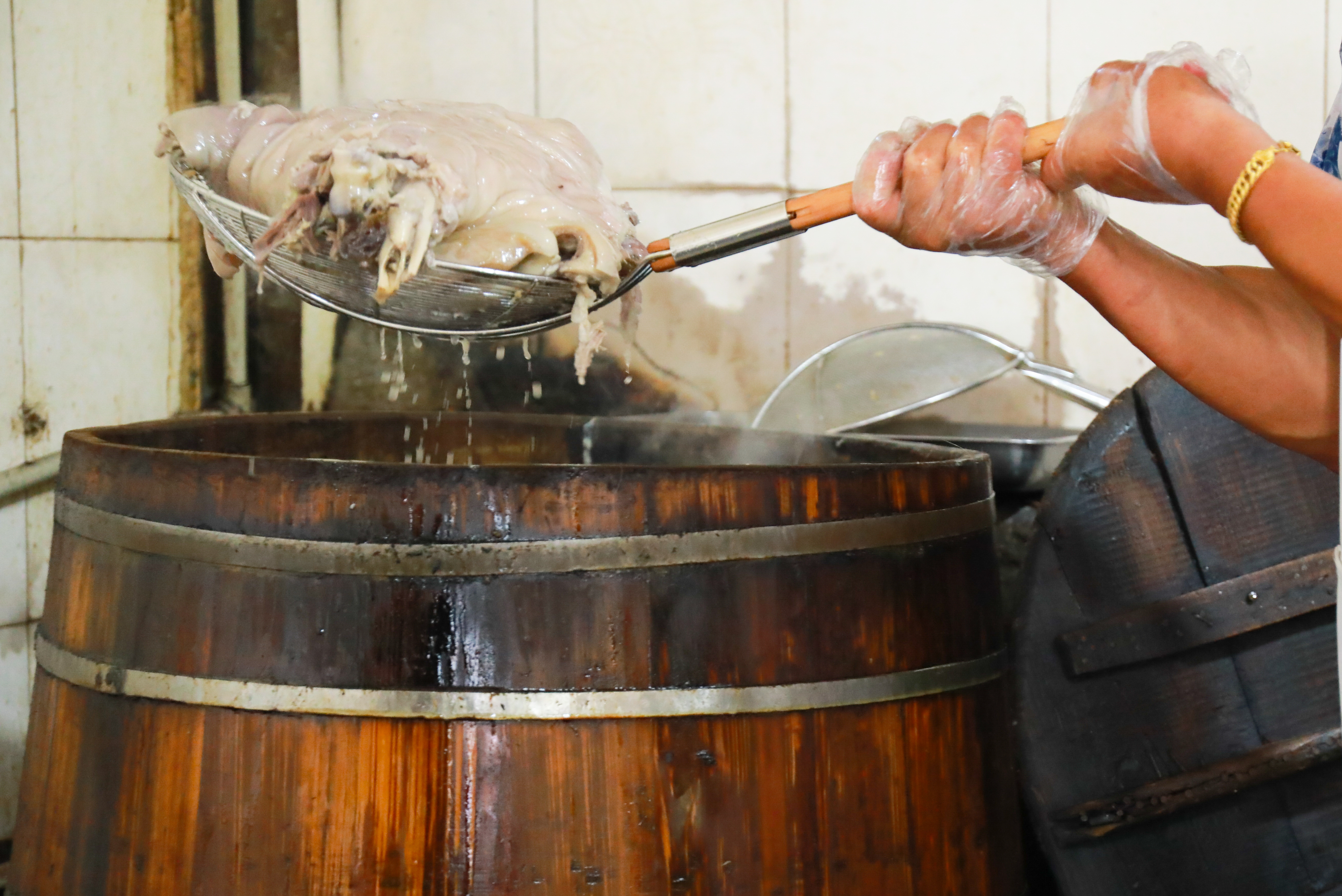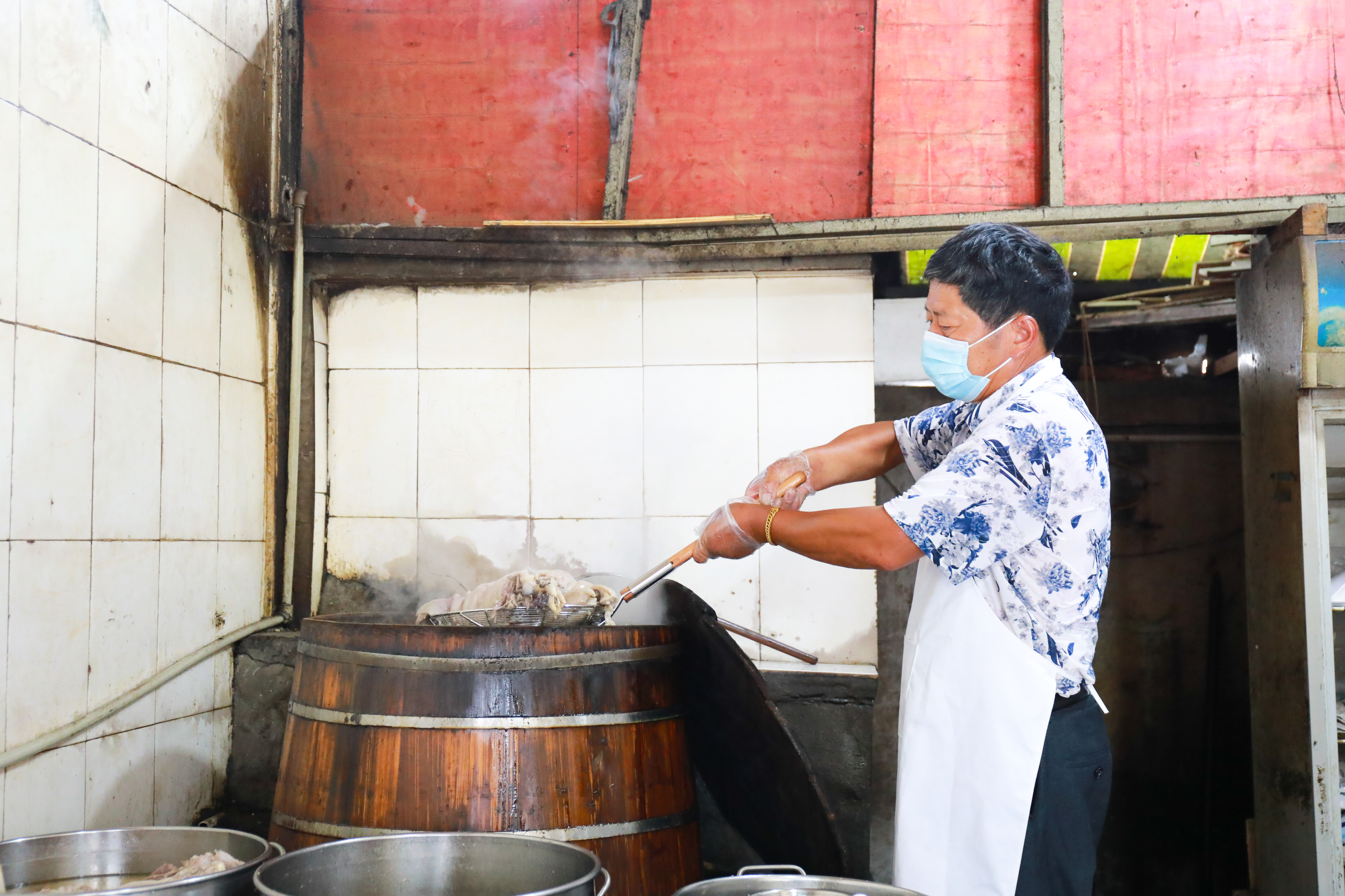 “木桶烧制羊肉,是张泽地区延续下来的传统烹饪方式。”2017年,张泽羊肉制作工艺被列入松江区非物质文化遗产代表性名录。作为这项区级非遗唯一的传承人,新明木桶羊肉店掌柜寿新明对制作工艺熟稔于心,一心传承非遗美食。