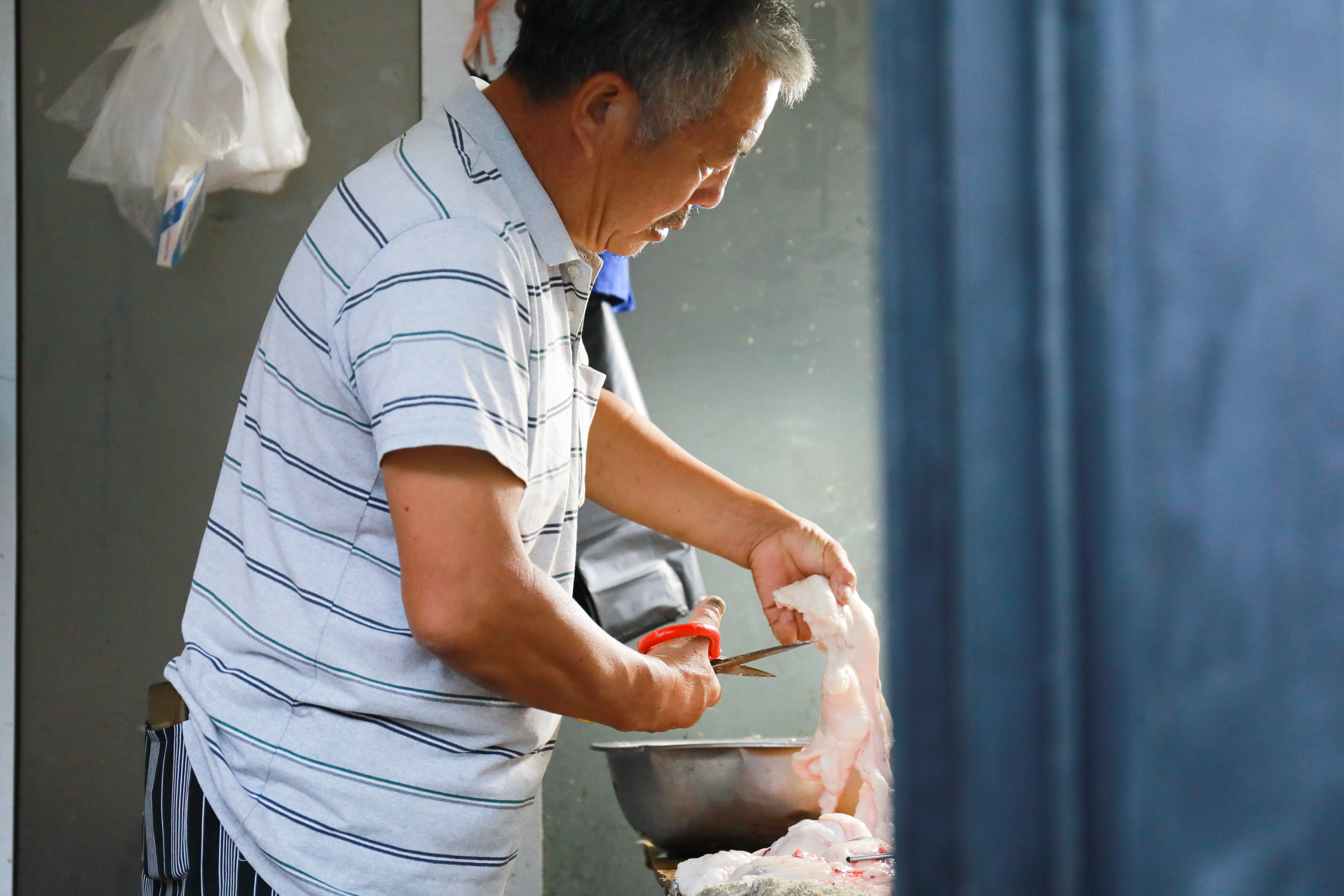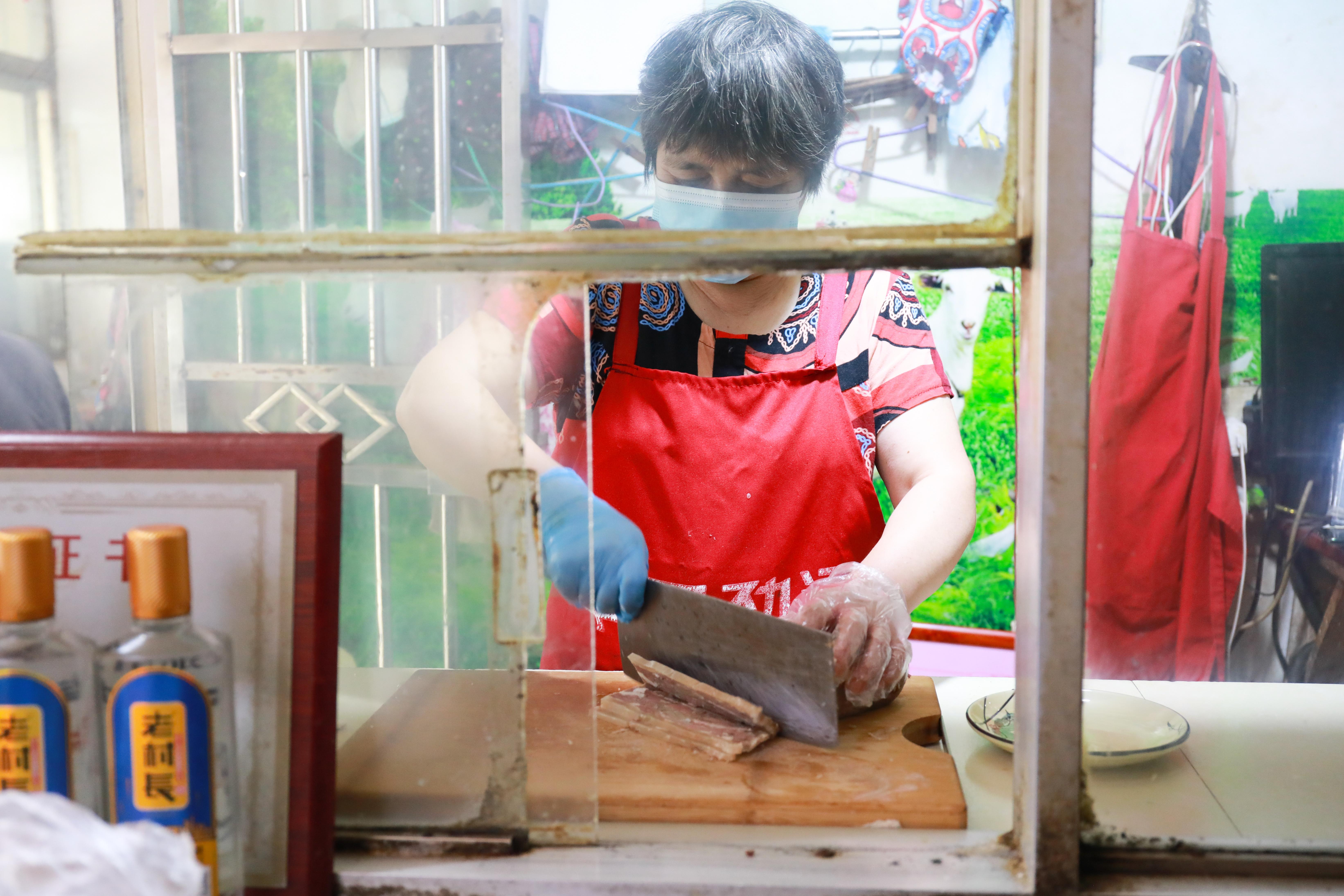 寿新明每天凌晨两点就开始准备烹制羊肉。从自家羊圈中精心挑选优质羊肉到下锅,每一道工序他都亲自把关,这一做便是24年。“羊的腰腹部很好吃,后腿做白切羊肉,前胛做烂糊羊肉,原汤呈黄色就表示到位了。”寿新明一一介绍羊肉的烹饪部位及最佳烹饪方法,并在厨房中驾轻就熟地处理食材及烹饪羊肉。