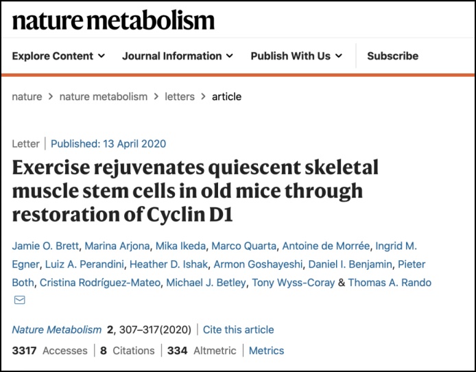2020年4月刊发在《Nature Metabolism》(自然·代谢)杂志一项研究发现,有氧运动可提高老年小鼠的肌肉修复能力,改善老年小鼠的肌肉干细胞功能,使其恢复到年轻状态。