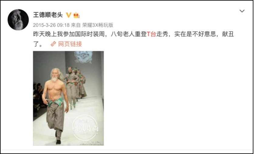 2015年一张“白发T台走秀”的照片火遍了全网,那时候照片里的主角王德顺已经79岁了。