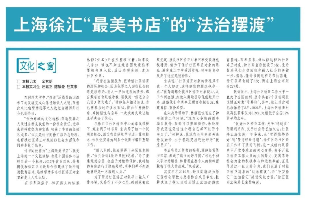 “作为申城的文化地标,帮助犯罪之人改过自新是我们的一份社会责任,近年来的持续努力和实践,收获了丰富的经验和成果。”朱兵是钟书阁徐汇店的总经理,在帮扶社区矫正对象回归社会方面他和同事奉献了很多。