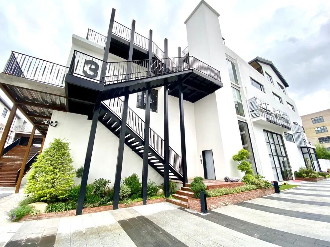 园区内以极简与工业风格混搭,演绎时尚艺术酷味,利落的黑白建筑之间点缀木色和绿植,极其富有层次感。