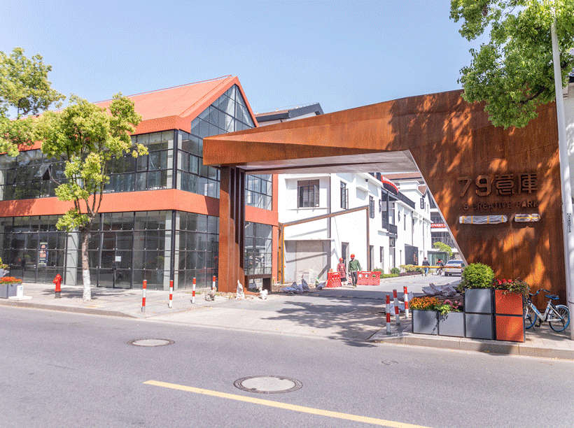 沿沪闵路光华路路口往西行约50米,会依次发现两个做旧工业风设计的气派门头,上面赫然标识着“79意库”几个大字,而里面清一色的徽派建筑群,又显示着这里与众不同的文化艺术品位。