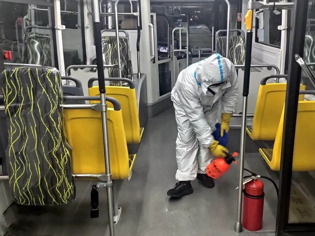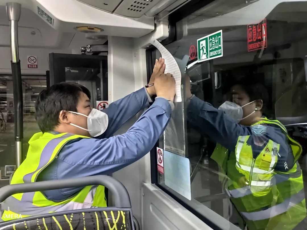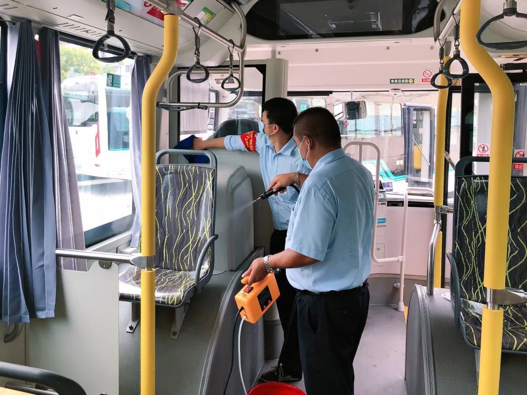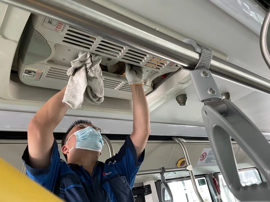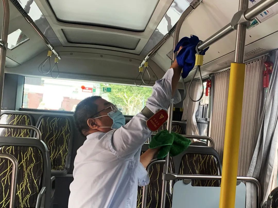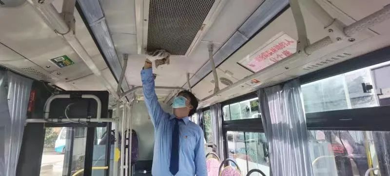 巴士五公司65路消毒清洁时严格遵守“一喷”(喷撒按比例稀释过的消毒液)、“二闷”(门窗关闭15分钟以上)、“三擦”(擦拭车厢内设施)、“四通风”(开启门窗通风)。对车内空调出风口、扶手、地板、司机方向盘、车窗开关把手等部位的消毒清洁做到不遗漏任何一个盲区死角。