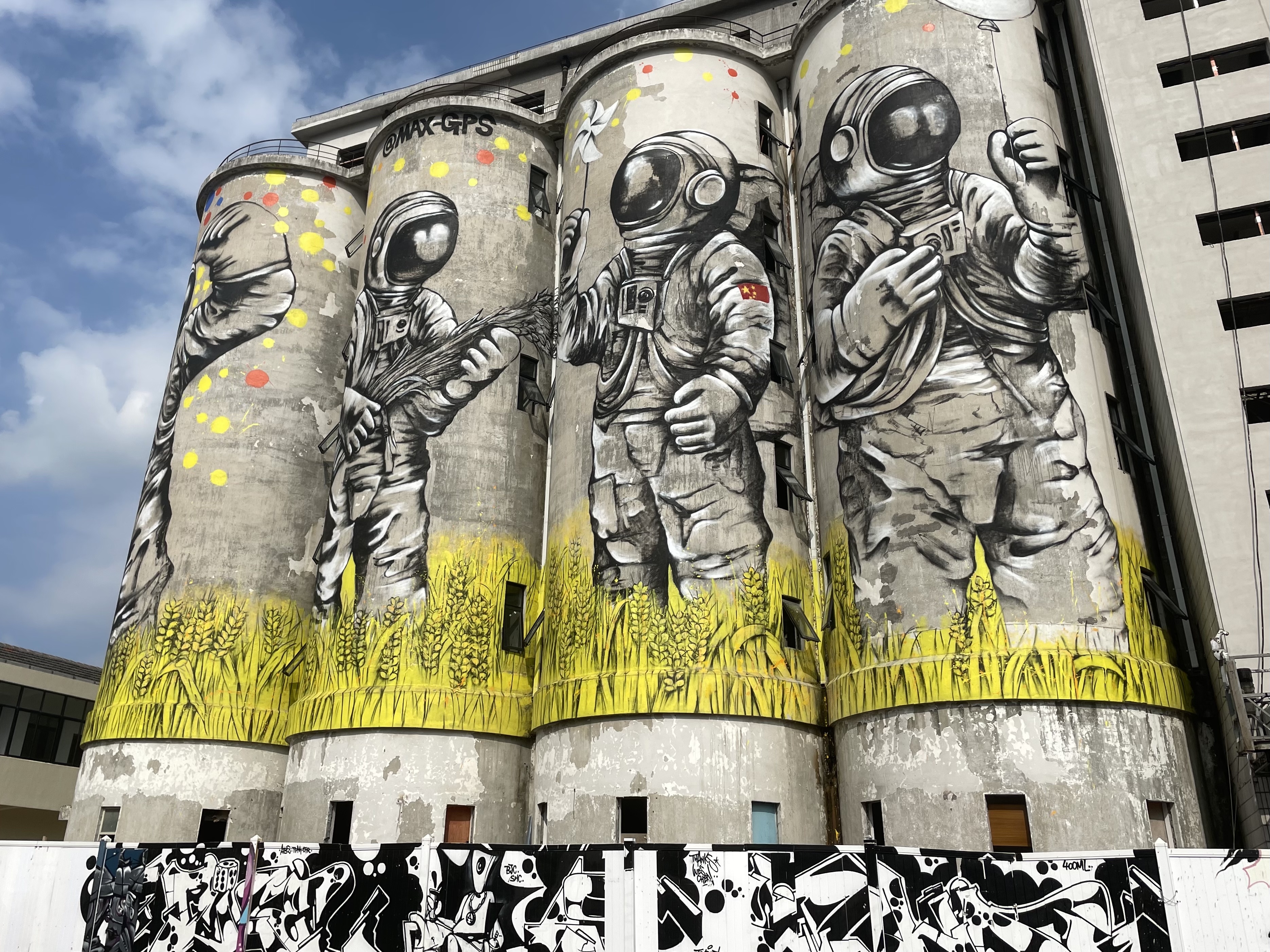事实上,园区浓厚的艺术氛围离不开涂鸦艺术,也是云间粮仓的亮点所在。园区非常看重草根艺术群体的自我表现,相继多次开展涂鸦自由创作活动,鼓励艺术家们在涂鸦创作中融入与松江历史、粮食文化相关的元素,吸引了诸多艺术爱好者前来创作。例如反映松江本土文化的“十鹿九回头”涂鸦艺术墙;将粮食文化与宇航员的结合的筒仓涂鸦——稻田守望者;以诗人戴望舒在松江留下的代表作“雨巷”为主题的雨巷涂鸦等,多角度、多形式、多层面地展现着园区历史文化。