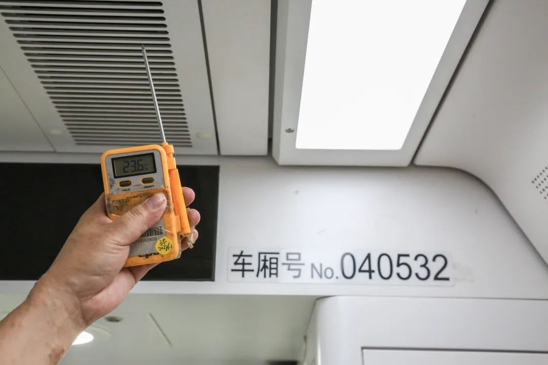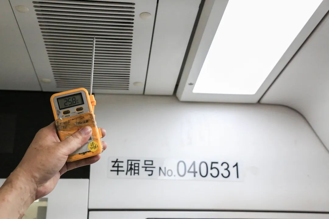 据了解,在列车出库前,维保人员会根据当天天气预报的最高气温进行空调温度设定(譬如当天最高气温为35℃,普通车厢温度则会设定在24℃左右,弱冷车厢则为26℃左右)。