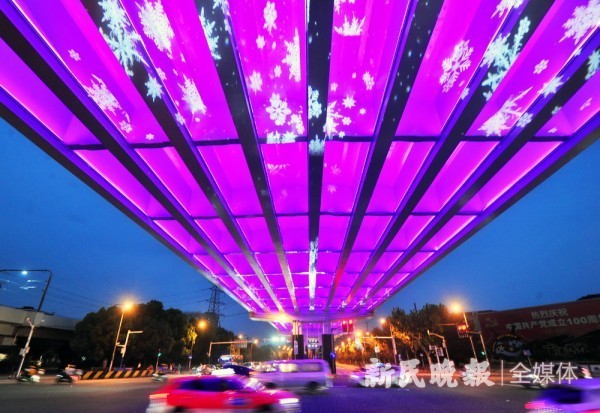 入夜,好戏依旧不停。宝山区同济路宝杨路路口高架路下新装LED灯带,“灯光秀”近日火热开演。居民饭后消食散步,抬头便是满眼的浪漫,五彩缤纷的“天幕”上有晶莹的“雪花”飘落,让暑气顿消。都市夜归人,则伴着一路“流动的盛宴”,连回家的脚步也轻快了。