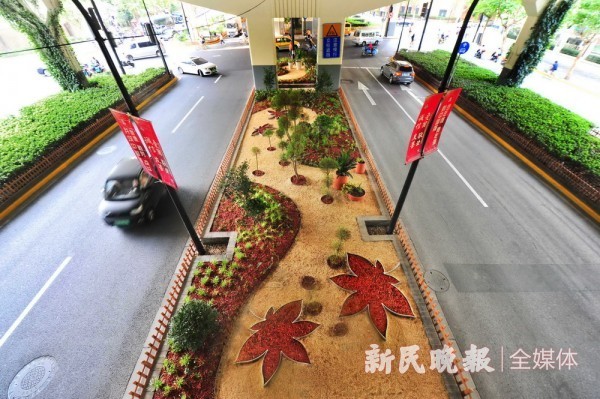 △图为南北高架黄浦段的桥荫桥孔环境经过全面整治后面貌焕然一新,整体绿带突破传统模式,放置陶罐花钵组合、木桩与山石等园艺小品,将植物与小品完美结合,使原本灰暗的高架桥下空间更显缤纷多彩