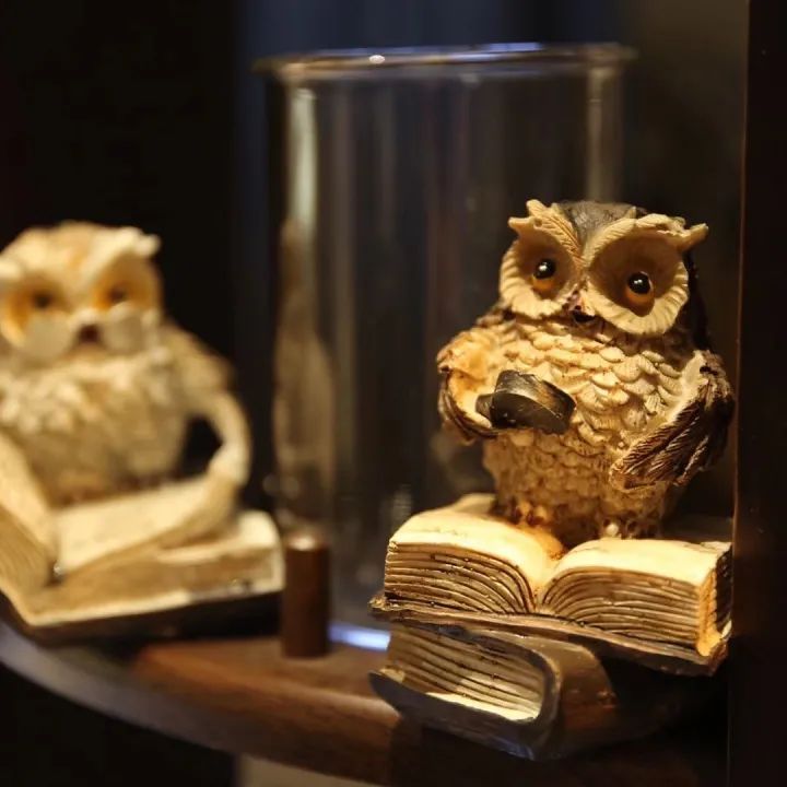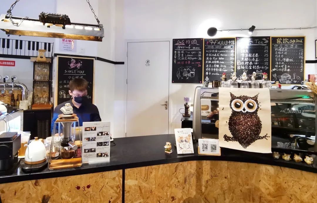 熟悉猫悦上城的人都知道它的logo是一只猫头鹰,意为像猫头鹰一样用独有视角聚焦文化产业。为了让OmS戏剧图书馆咖啡吧台与运营理念和氛围更加契合,运营方对环境、菜单和服务进行了升级。现场可以看到,咖啡吧台上的书籍、摆件等满是形态不一的“猫头鹰”,萌趣可爱。