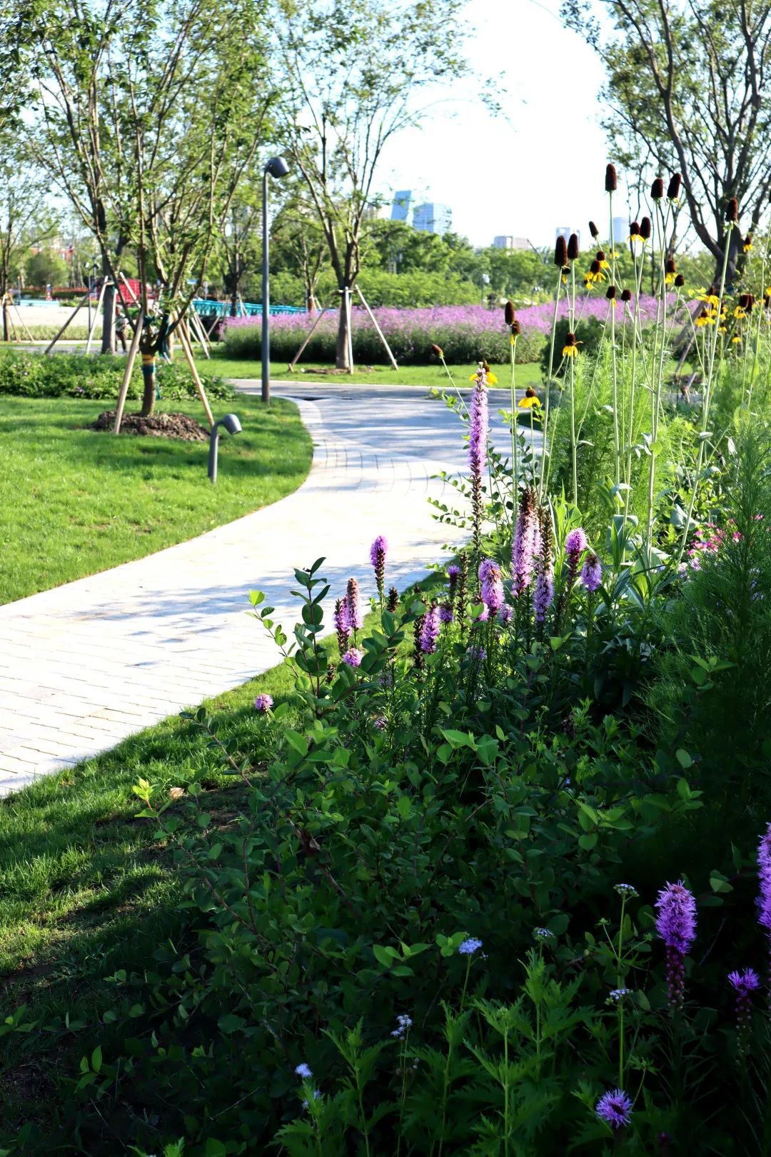 公园内约有1000米水岸沿线,沿着滨河步道采用不同季相植物品种的搭配形成一条四季可观色、季季色不同的景观步行道。