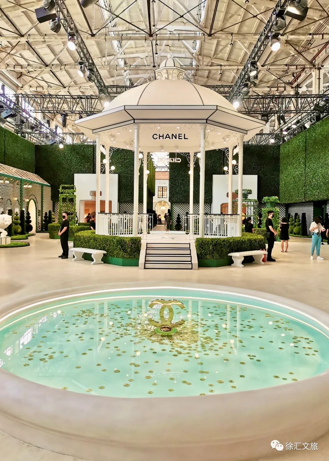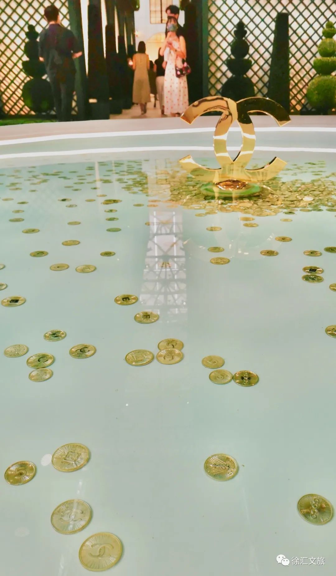 亭子前的许愿池泛着粼粼波光,走近细看,原来池中散落的许愿币,一枚枚都印着香奈儿香水的各种元素图案。