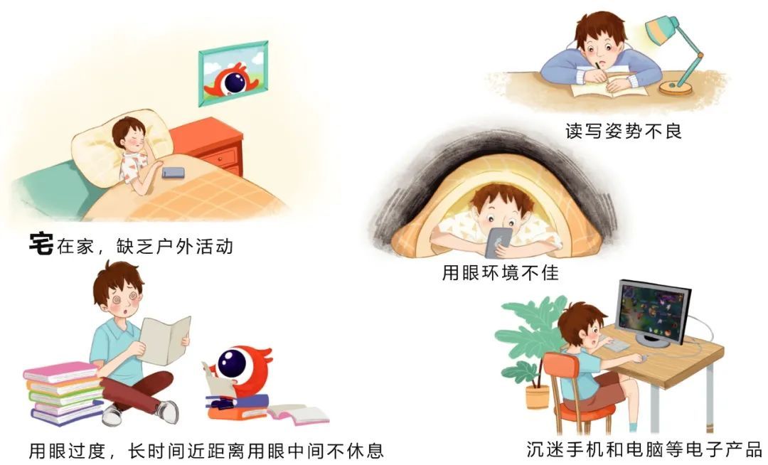 过度消耗远视储备的生活习惯:户外活动缺乏、长时期过度近距离用眼,包括高负荷的作业负担或过度使用电子产品;睡眠不足、饮食不平衡等。
