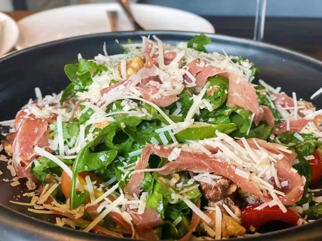 另一款芝麻菜色拉以芝麻菜、樱桃番茄配帕马森芝士和火腿片,还特别添加了核桃增加口感。餐厅经理介绍,悦未家沙拉种类丰富,烤大虾芒果色拉、水果藜麦沙拉等都受到食客们的好评。