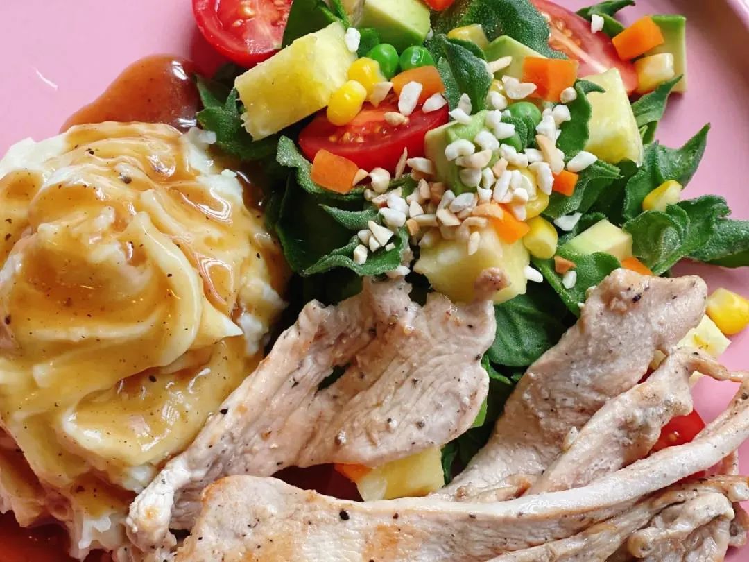这家万花筒色拉主打现点现做,食材新鲜。他家的鸡胸肉色拉采用冰草基底,鸡胸肉一点不柴还多汁,同时搭配两次过筛的细腻土豆泥,和多种不同口味的酱汁,让每一位减肥路上的逐梦人,都能大快朵颐。