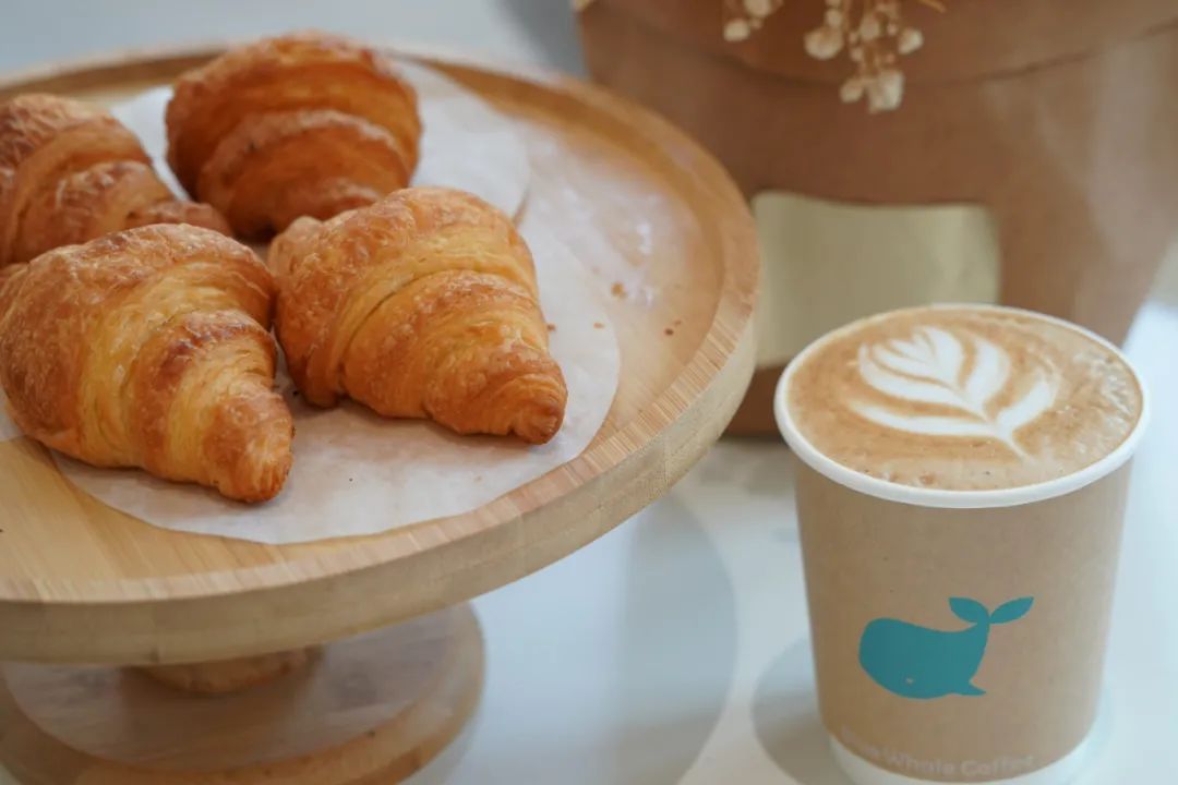 小羊角是蓝鲸家面包中的尖子生,表皮烤得焦黄酥脆,内里起酥层柔软均匀,充盈着满满的黄油香气。再来上一杯温润的拿铁,激发双倍醇香,美好的一天就这样开启了……