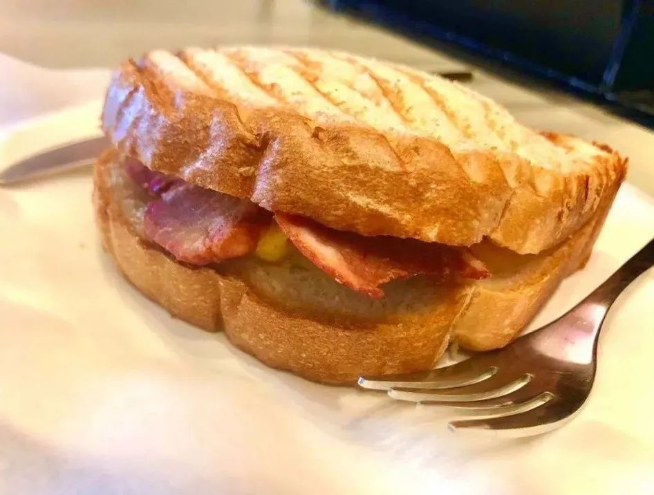 早安上海面包,是一款主打酸甜口味的高颜值早餐,烤面包上覆盖了一整片的火腿和煎鸡蛋,淋上芝士番茄酱,妥妥的“笑脸吐司”~