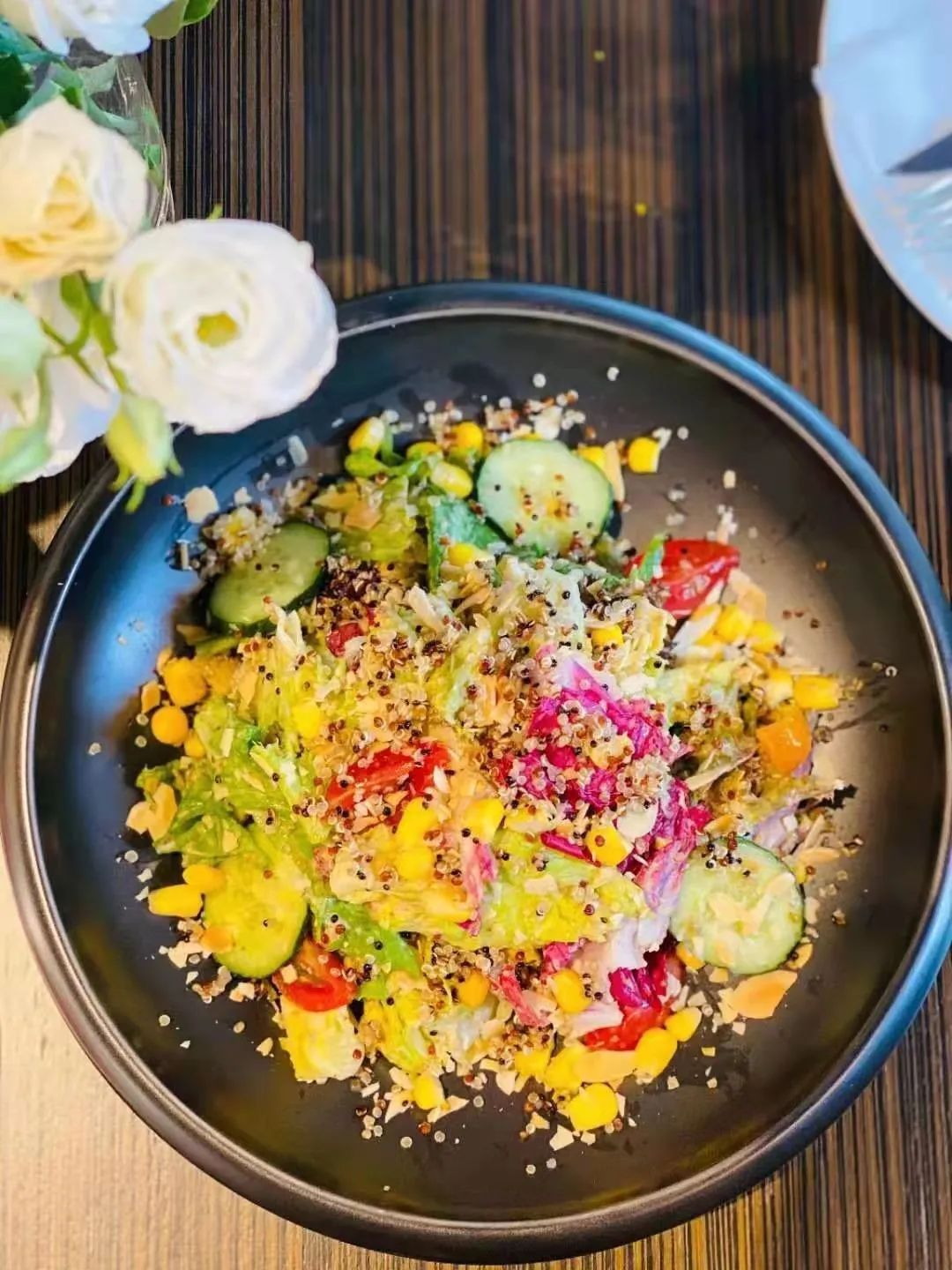 田园色拉是悦未家的明星产品。脆嫩黄瓜、香糯玉米、酸甜小番茄搭配藜麦,薄脆杏仁片和少许芝麻酱加以点缀,色彩雅致,颜值满分!