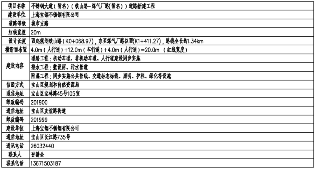 据了解,不锈钢大道(暂名)(铁山路-煤气厂路(暂名))道路新建工程建设单位是上海宝钢不锈钢有限公司。红线宽度20m,设计长度是西起规划铁山路,东至煤气厂路以西,路线全长约1.34km。建设内容包括道路工程(机动车道、非机动车道、人行道建设同步实施)、排水工程(敷设雨、污水管道)、附属工程(同步实施公共管线、交通标志标线、照明、护栏、绿化等设施)。
