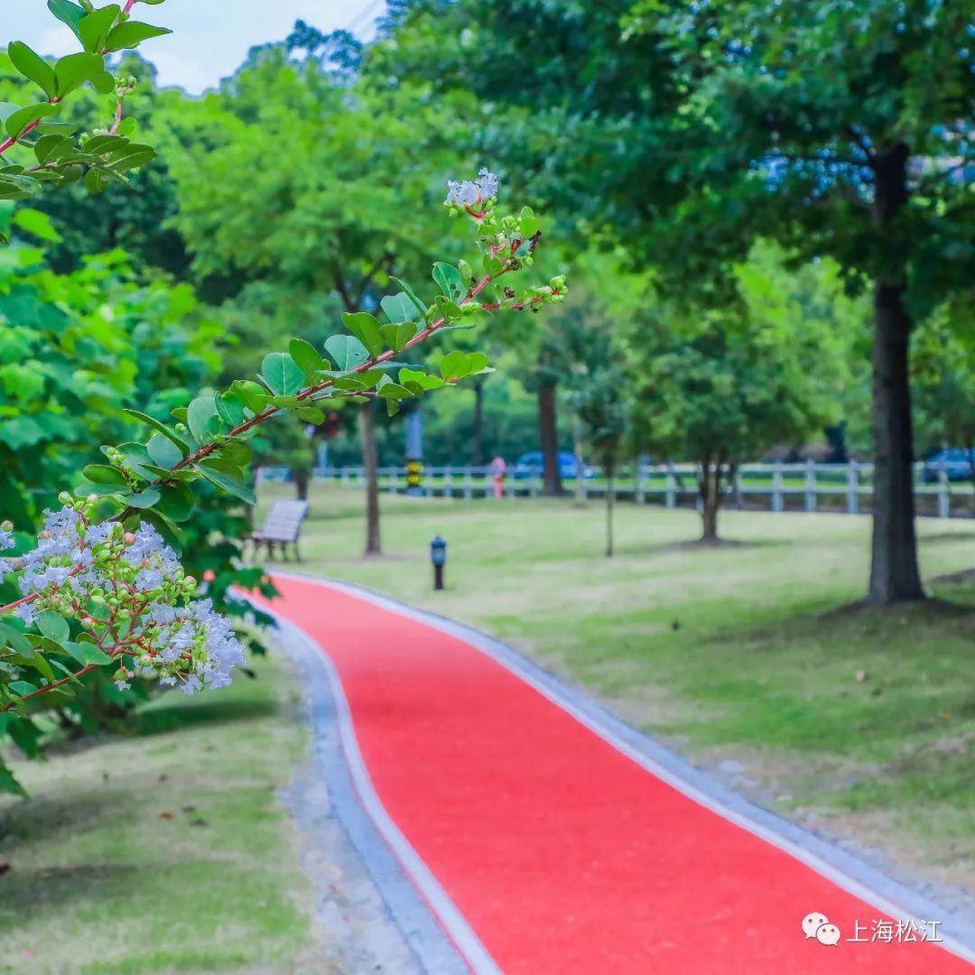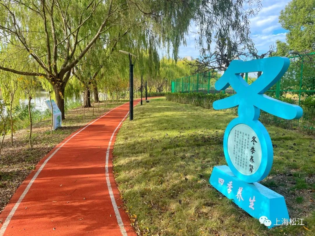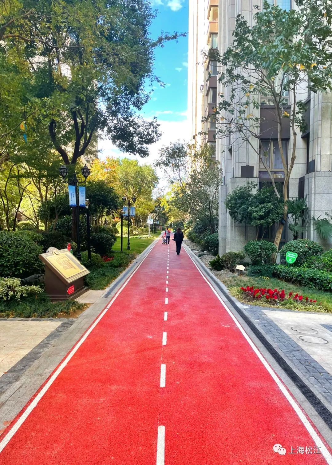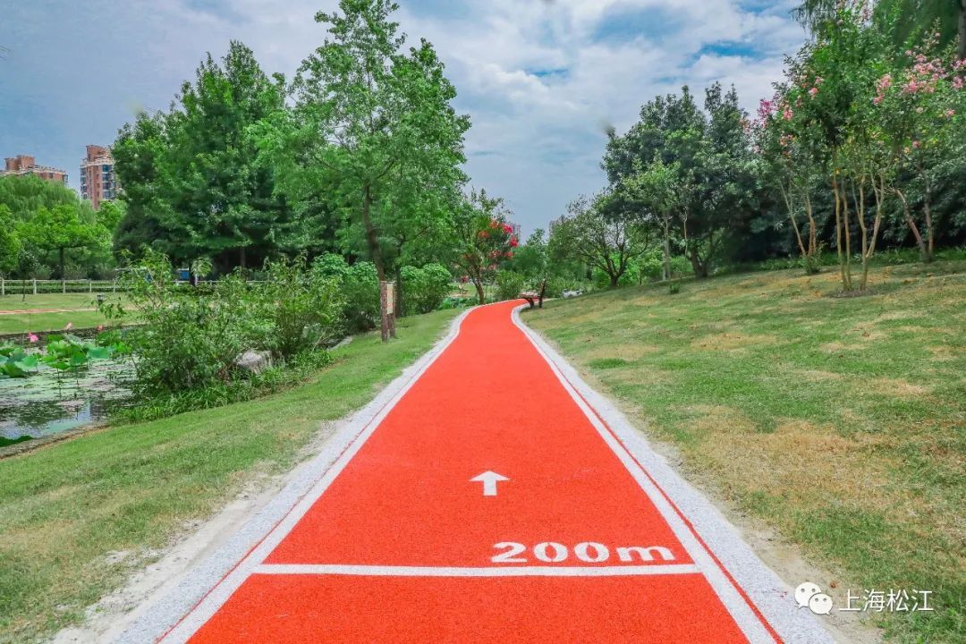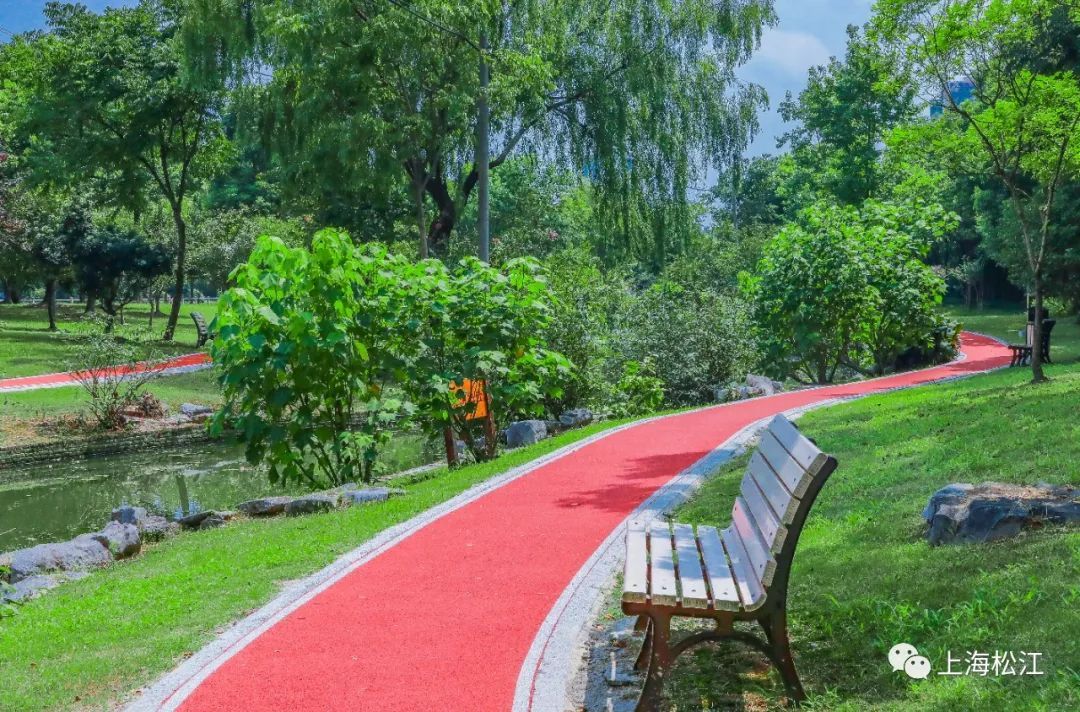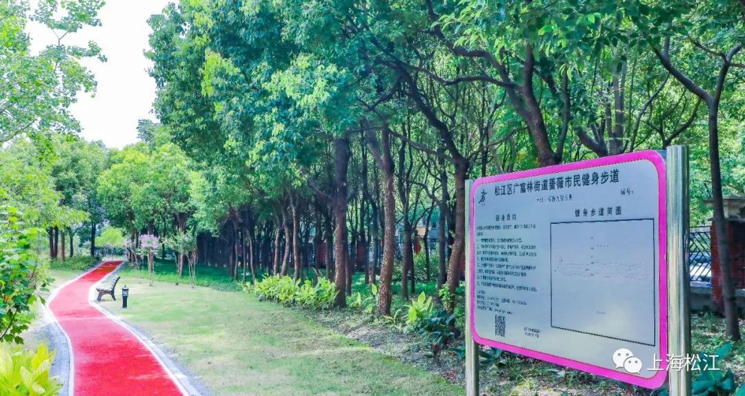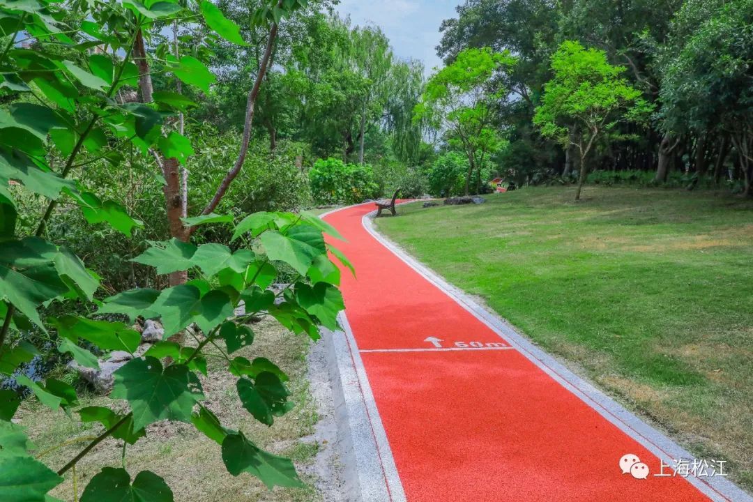 据介绍,这条全新的健身步道位于嘉松南路广富林路西北角公共绿地内,紧邻绿地蔷薇九里小区,全长685米,沿着绿地内的景观河道岸线一路延展,四周绿植茂盛,路面平坦开阔,无论是散步还是慢跑都很适合。