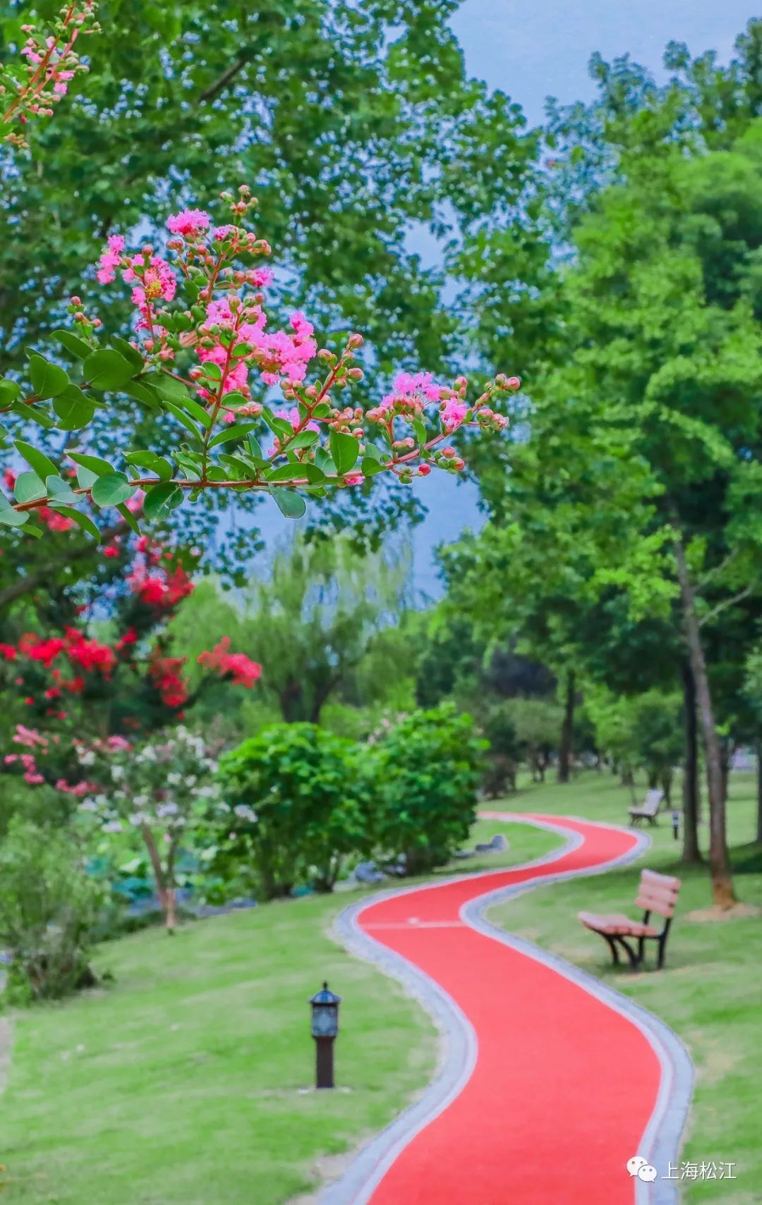 傍晚时分,微风徐徐,小松在现场看到,已经有不少市民前来游玩锻炼。三三两两的人群或悠闲地散步,或有节奏地慢跑,一路上有树木遮阴,有翠绿环绕,还有一池荷花和一树紫薇花开相伴,构成了一幅惬意的生活画卷。