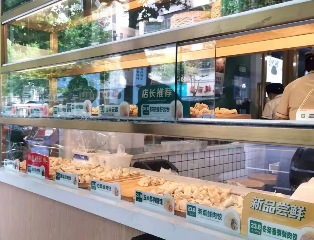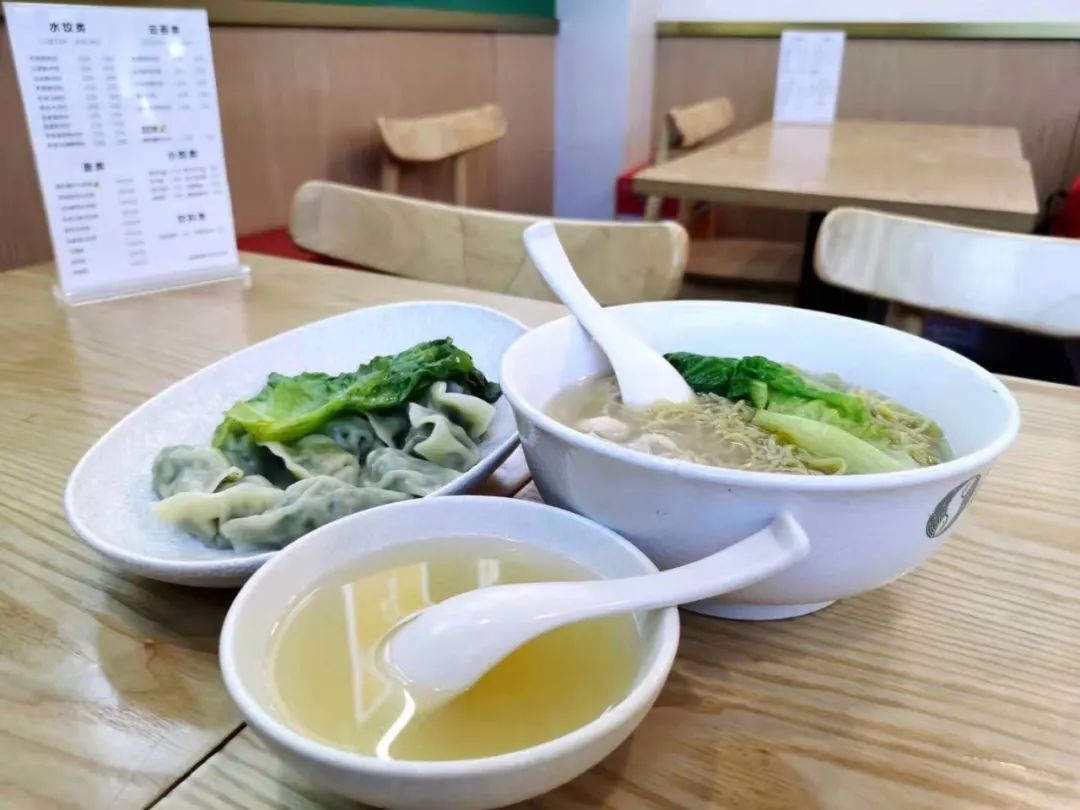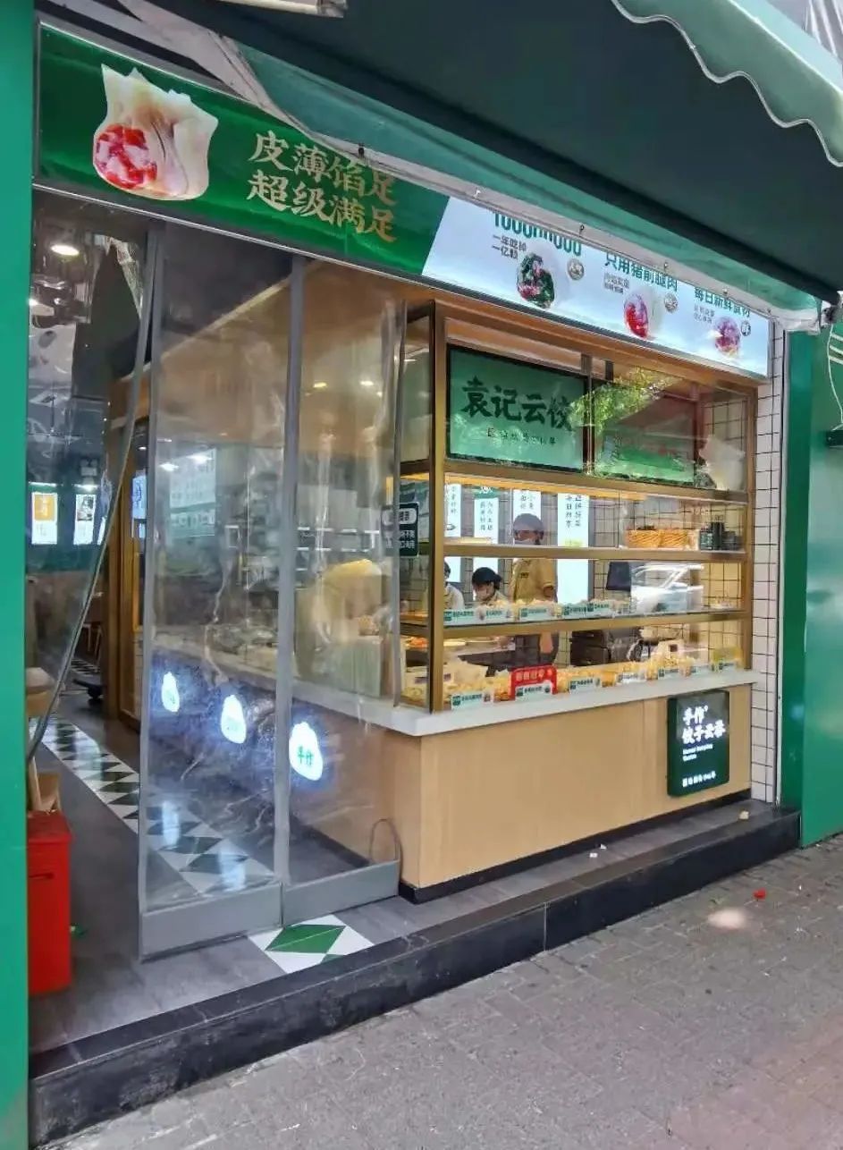 沿街而开的袁记云饺,门面并不算宽敞,但清新的绿色招牌和摆放着新鲜水饺云吞的透明橱窗,却分外显眼。