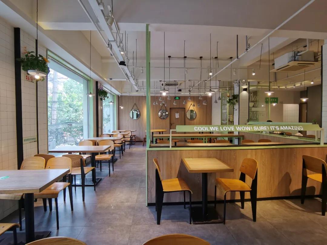 饭堂共有上下两层,最多可容纳200余人就餐。饭堂装修风格清新简约,墙面上黑白相间的简笔漫画为就餐环境增添了轻松时尚的氛围,尤其是二楼的靠窗区域,可将摇曳的梧桐和车水马龙尽收眼底,让人身心放松。