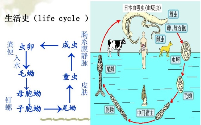 在中国流行的是日本血吸虫,其生活史可分为虫卵、毛蚴、胞蚴、尾蚴和成虫等阶段。感染血吸虫的人或者哺乳动物通过粪便排出虫卵,虫卵随粪便入水后,在水中孵出毛蚴;毛蚴钻入中间宿主钉螺体内,发育成尾蚴;人或哺乳动物接触含有尾蚴的水体(简称“疫水”)后,尾蚴钻入皮肤后而感染,并在体内发育成成虫,雌雄成虫结伴合抱,交配产卵,每条雌虫产卵约1000~3500个/天。