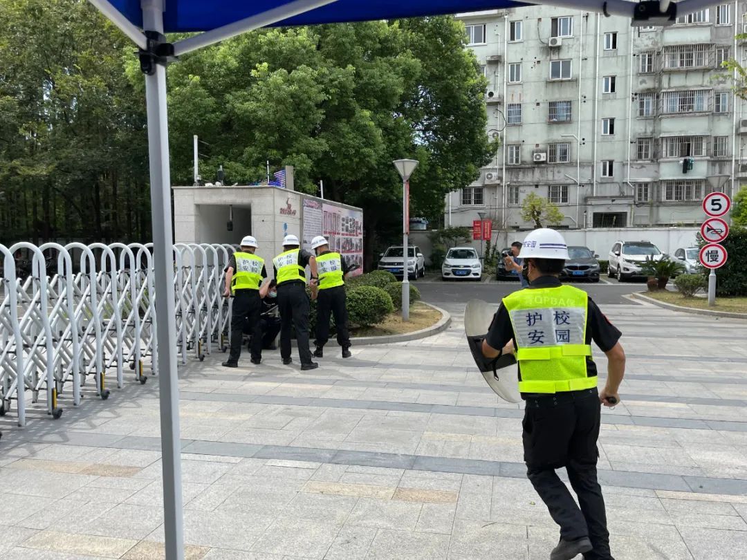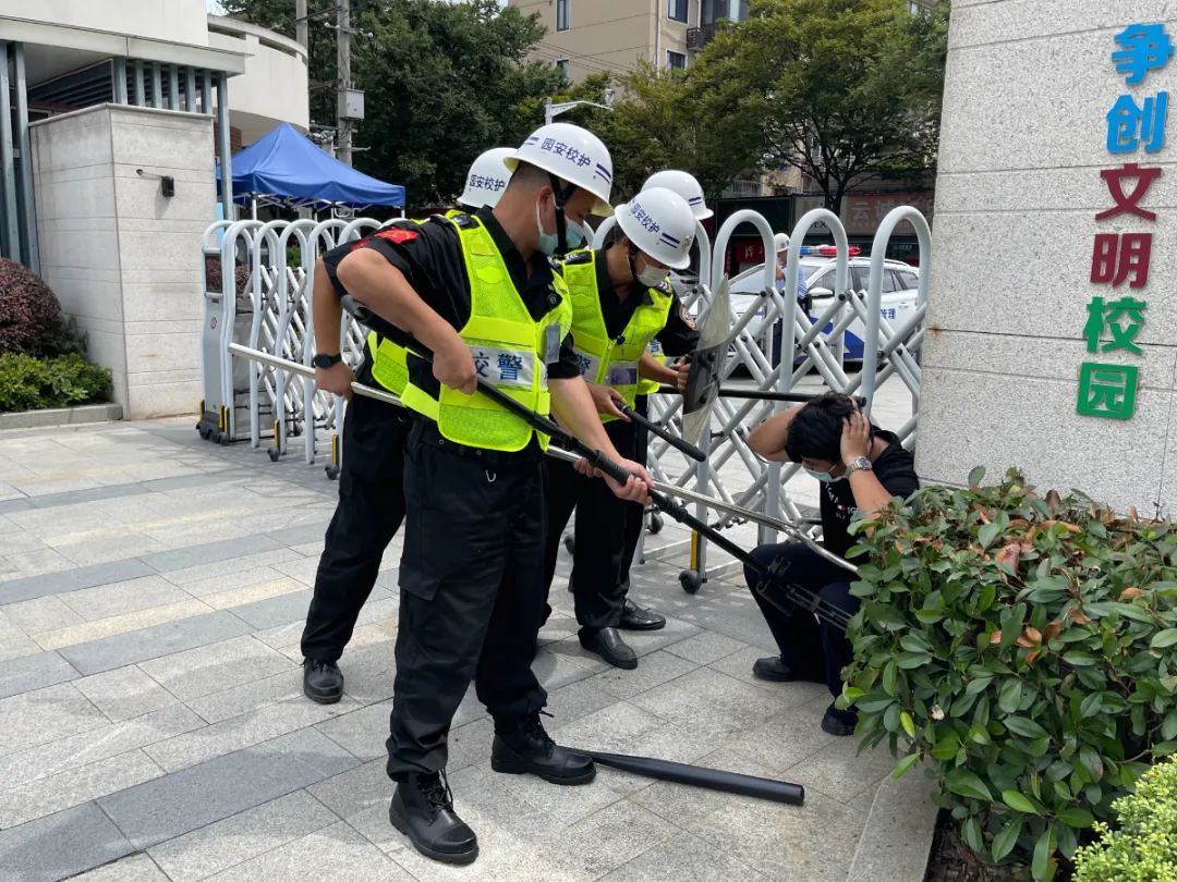 随后,在校门口,民警与保安还进行了一场生动的校园防暴演练。一名男子叫嚣着持械闯进学校,寻衅滋事,面对滋事人员,社区民警、校园安保工作人员第一时间启动应急预案,快速反应,一键报警、关闭校门、拉响警报,与此同时,安全岗人员分别持钢叉、盾牌、长棍等防暴器材与“暴恐分子”周旋、对抗,最终将“歹徒”安全控制。本次校园防暴演练旨在规范并提高校园应对突发事件的处置能力,确保校园安全、稳定。