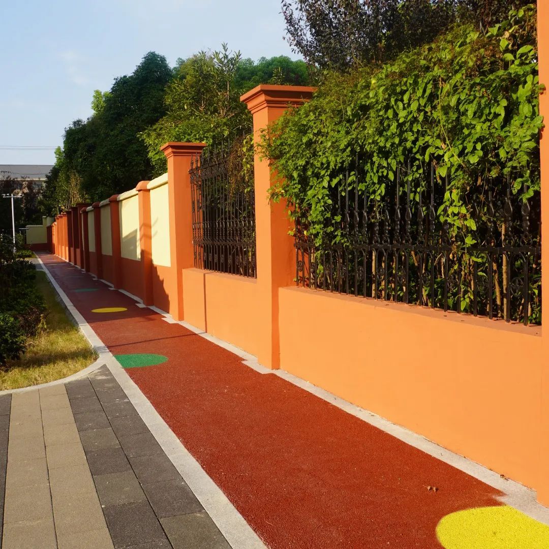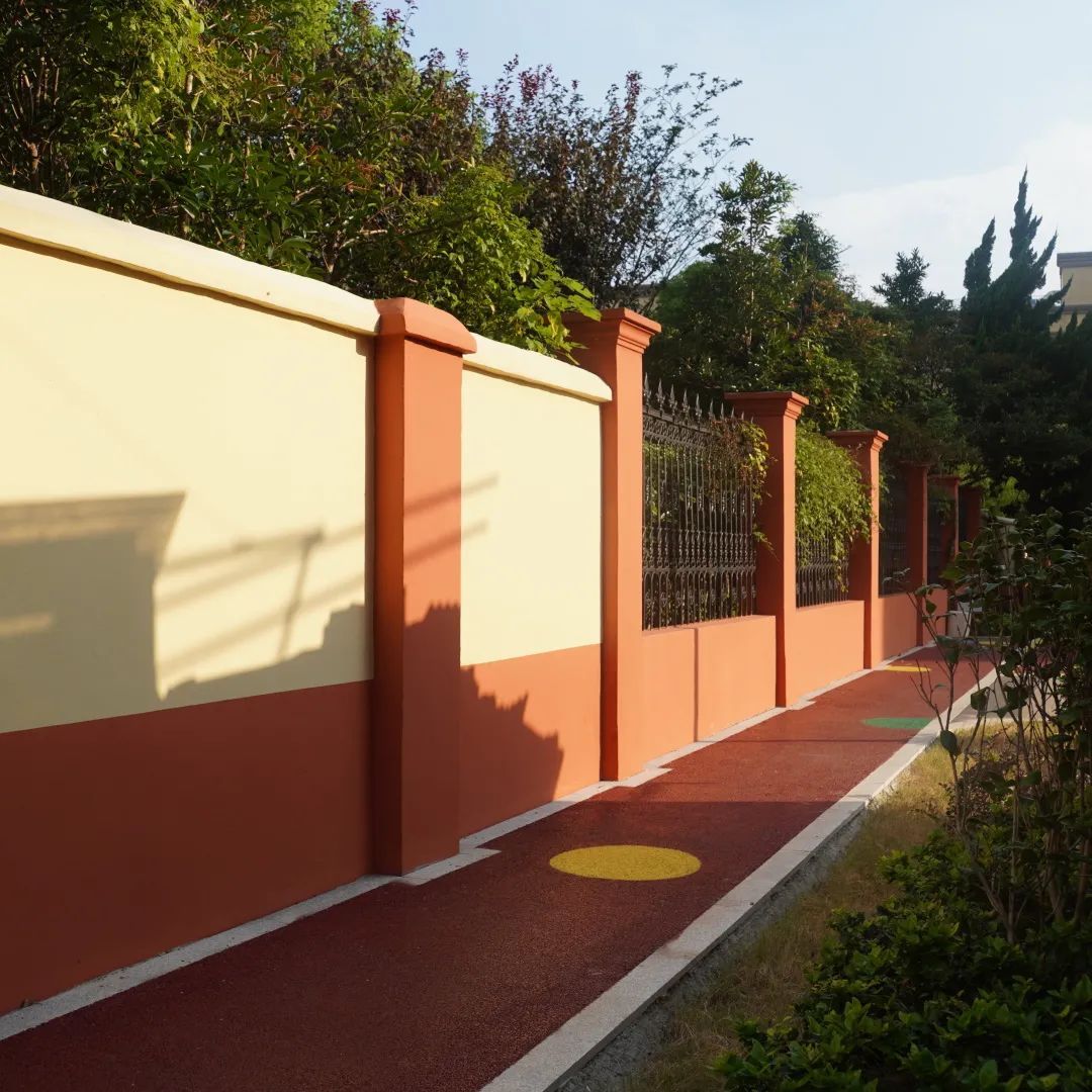 而连接两个小广场的纽带就是这条充满动感活力的健身步道。阳光照耀下,与房屋建筑颜色和谐呼应的围墙也明亮动人。围墙的透绿设计,让哈密公园那边的好风景不受阻挡,居民们可在“绿肺”旁健身运动。