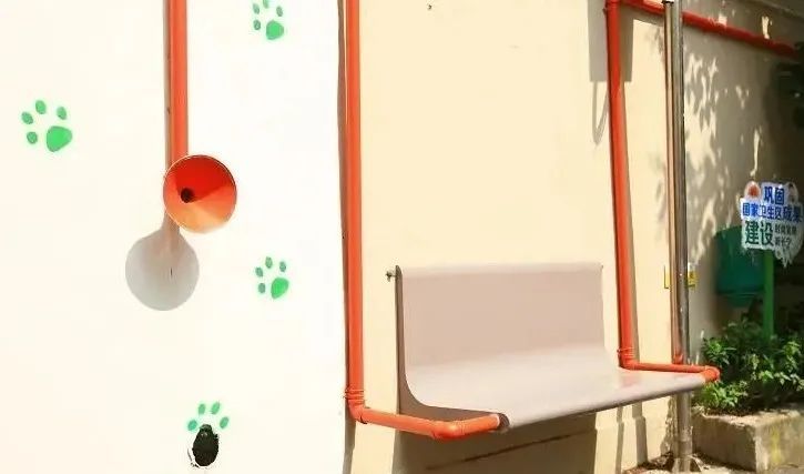 在改造的过程中,华阳路街道联合第三方社趣更馨走进居民中,倾听他们的想法,考虑他们的日常所需。所以,改造后的弄堂里既有供老人休息的椅子,也有让小朋友玩耍的传声筒。不经意间抬头,还会发现墙顶上“蹲”着三只惟妙惟肖的猫。据设计师介绍,前期走访弄堂时,常常看到有几只小猫在墙顶上,所以在弄堂改造时特意融入了这个元素,定格老弄堂的美好瞬间。
