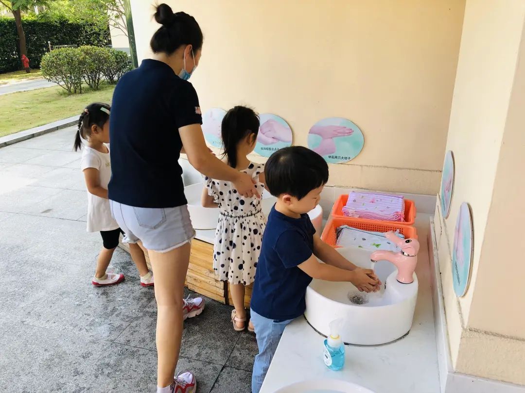 集体生活中,防疫卫生知识很重要。小朋友们开学第一天,先要学会如何正确洗手,旁边还有保健老师检查大家的卫生状况,及时发现并解决问题。