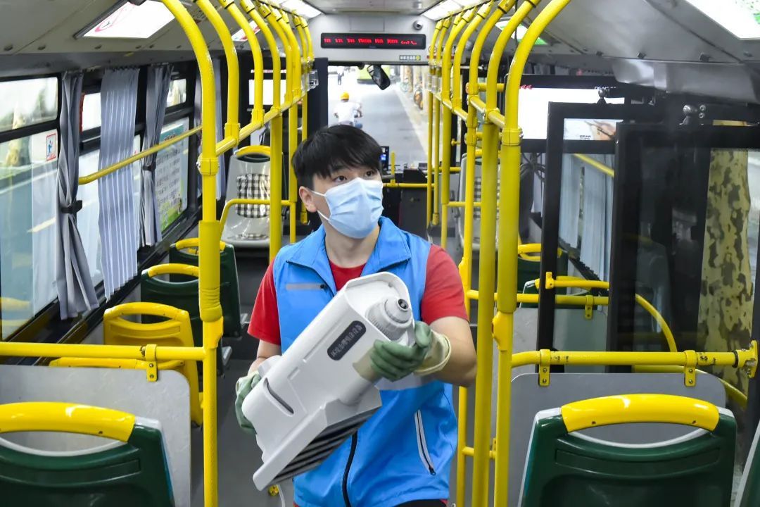 早上六点半,离长白路起点站发车还有30分钟时,工作人员便开始做准备了。车辆消毒采用无色无味的电动喷雾消毒器,能够持续对车厢进行消毒。消毒后,驾驶员王栩鸣拿来了早就准备好的爱心挂包,挂在了前门最显眼的位置,里面装了儿童口罩、成人口罩、雨衣、雨伞、消毒湿巾纸、消毒洗手液等物品。