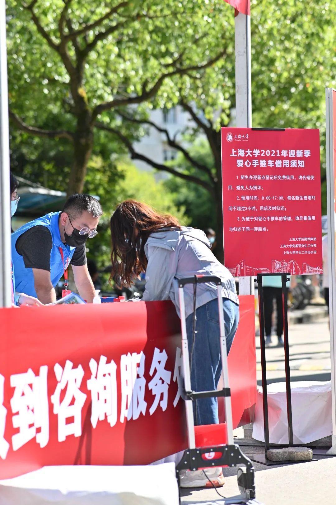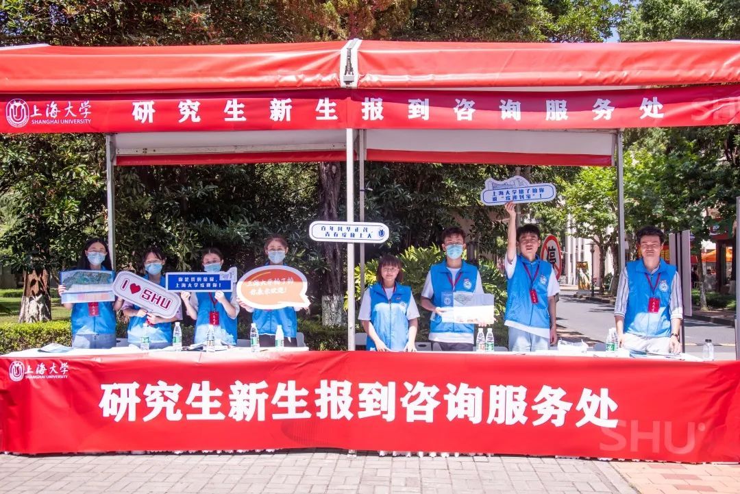 由上海大学研究生联合会牵头组织的校园迎新志愿者团队以及各学院的志愿者队伍一早便在各迎新点等候着新生们的到来。搬运行李、引导路线、答疑解惑,入学的手续,在学长学姐们的耐心指导下变得简易。