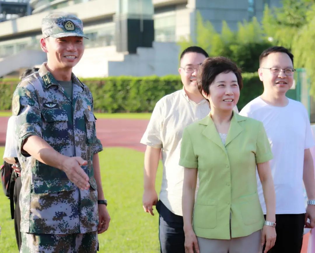 在南区体育场军训点,焦扬代表学校党委向承训的31604部队军训团团长和教导员们表示衷心感谢。此次学校军训人数多,两届学生共同参与,史无前例,再加上持续的高温天气,给承训教官和参训学生都带来很大挑战。感谢部队同志能够在繁忙的军事任务和军事训练当中,抽出时间来到学校,帮助我们进行国防教育和军事训练,给了复旦大学极大的支持。关照承训官兵在严格带教同时,也要注意高温天自己做好防护。