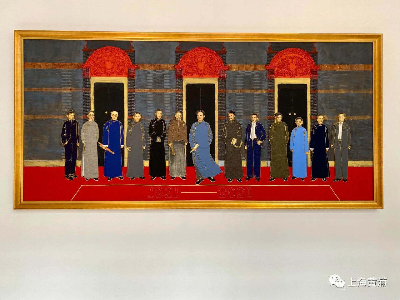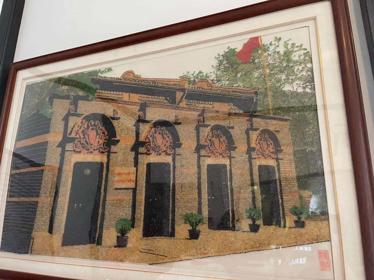 除了蓬莱路第二小学的“蓬蓬莱莱学党史”游戏,复兴·颂还有不少红色主题的文创品、绘画作品展示。在“希望之门”,两幅红色主题的非遗作品,吸引了众多参观者的拍照留念。由黄浦区非物质文化遗产项目五谷杂粮工艺画代表性传承人洪有进,创作的《中共一大会址》,由芝麻、田菁籽、芹菜籽、小米、野生种子等材料,经过12道工序,用一根牙签一粒粒在亚克力板上粘贴而成,画面清晰、层次分明,立体突出,寓意深远。