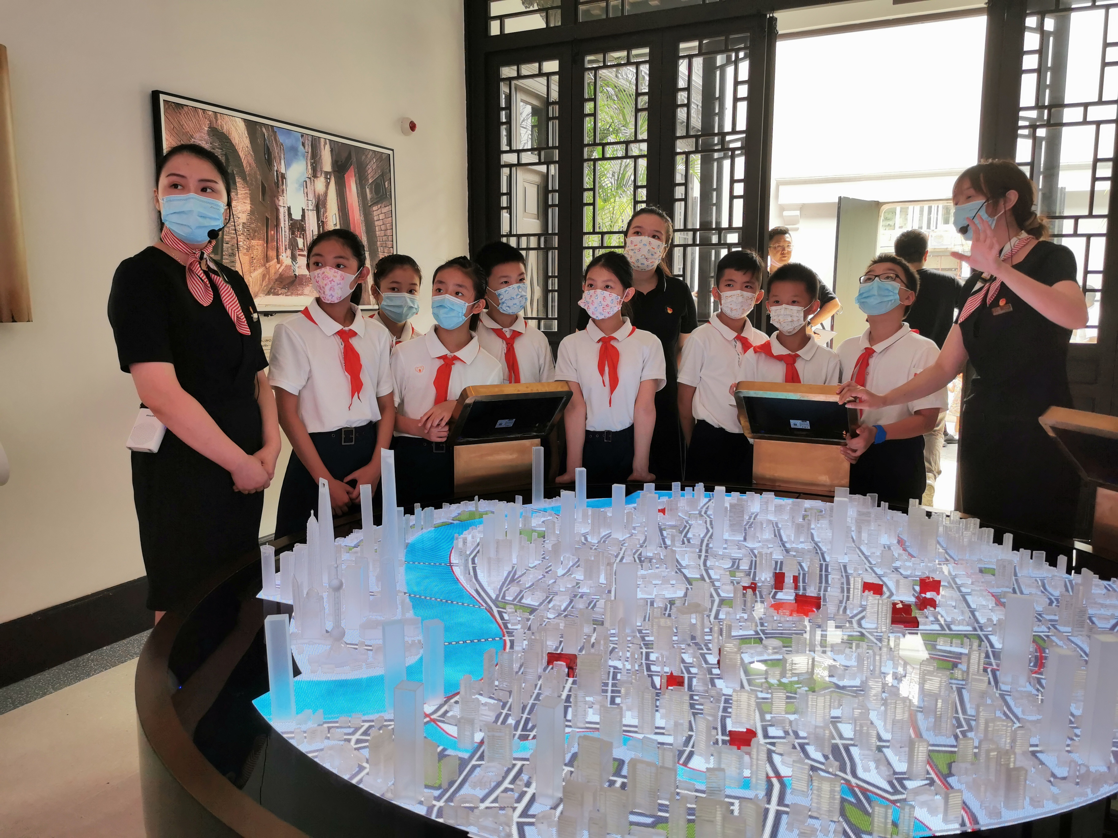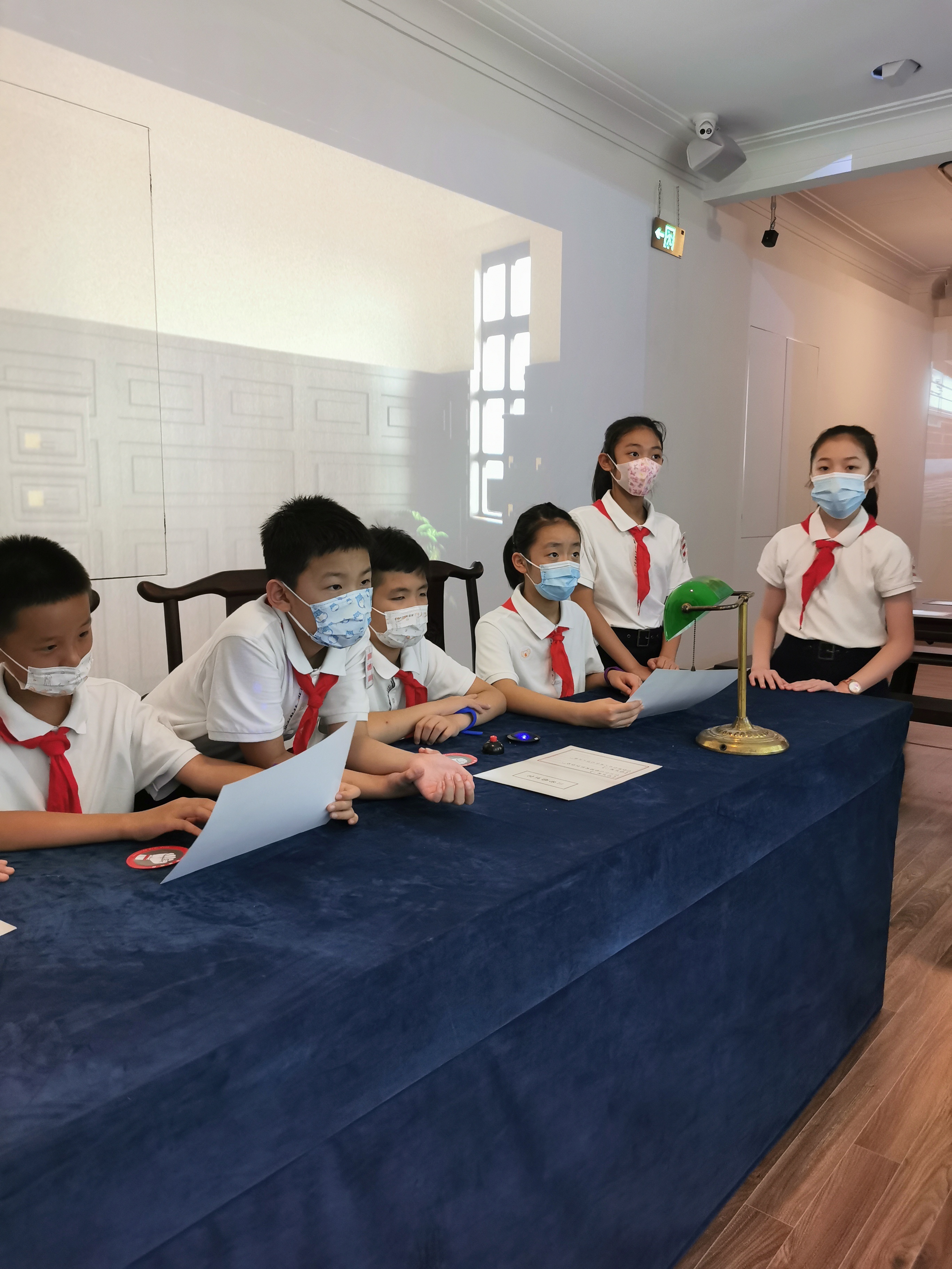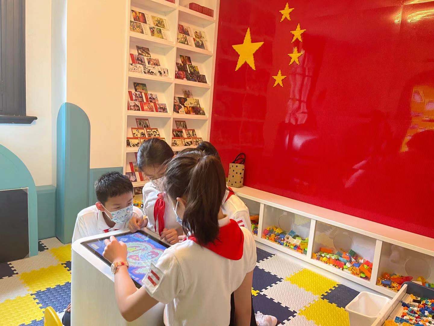 在儿童游戏区,郝婧艺玩起了由学校同学自制的一款“蓬蓬莱莱学党史”游戏棋,工作人员告诉记者,这款游戏棋原为手绘纸质版,后来,学校在黄浦区委宣传部“逐梦新时代”项目的支持下,开发了电子版本,搭载在区内红色场馆内,为参观者增加一处了解党史知识的互动体验。“又有趣又有挑战!”,郝婧艺说,“我们一边玩游戏,一边学党史,拥有了双倍的快乐。”