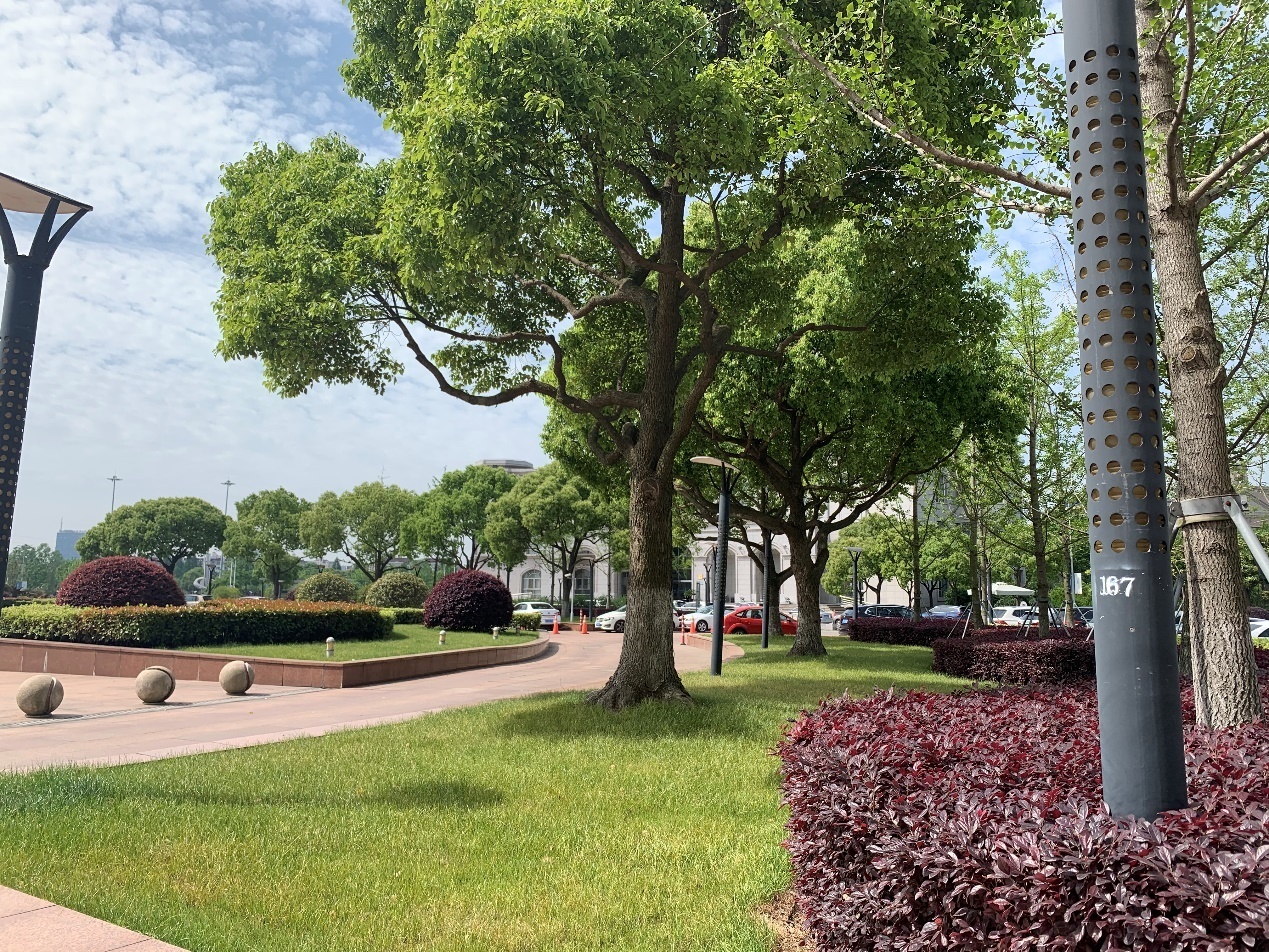 区办公中心大院采用了乔木、灌木和草坪结合的复层绿化,形成错落有致的植物造景。由于乔木覆盖率高,活动场地夏有庇荫、冬有日照。绿化品种均为适宜在本地生长、耐候性强的植物。一年四季鸟语花香,时时处处绿意盎然,正是区办公中心自然环境的真实写照。