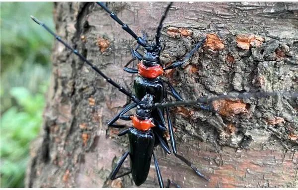 这两种颜色不同形态相似的昆虫都是天牛,红脖子的叫桃红颈天牛,斑点外衣的叫星天牛,它们都是钻蛀型害虫,只是取食的对象不同。天牛类是环城绿带中危害最大的害虫之一,它在幼虫期会钻入受害树木的韧皮部甚至木质部,久而久之便会把树木蛀空,造成断枝或是倒伏,造成极大的安全隐患。园林工人们一般采取人工钩捉幼虫、捕捉交配期成虫或是喷洒穿透力强的药剂进行防治。
