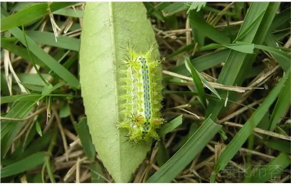 这只浑身带刺的家伙一看就不好惹,没错,它就是我们常说的“洋辣子”,学名丽绿刺蛾。该虫是重要的园林害虫之一。在幼虫期,它会大量取食多种植物的叶片,成长到高龄后,最终结茧羽化,变成飞蛾。值得关注的是,它全身都有密集的毒刺,如稍有不慎与其接触,便会痒痛难忍,所以看到它一定要离得远远的哦。