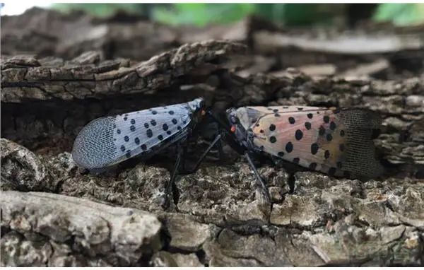 这两只外貌花哨的昆虫名叫斑衣蜡蝉,它们的翅膀上布满了花哨的斑点,因而俗称“花姑娘”。这种昆虫是知了的一种,喜欢取食臭椿的汁液,如果种群达到一定数量,亦会对树木造成很大的危害。