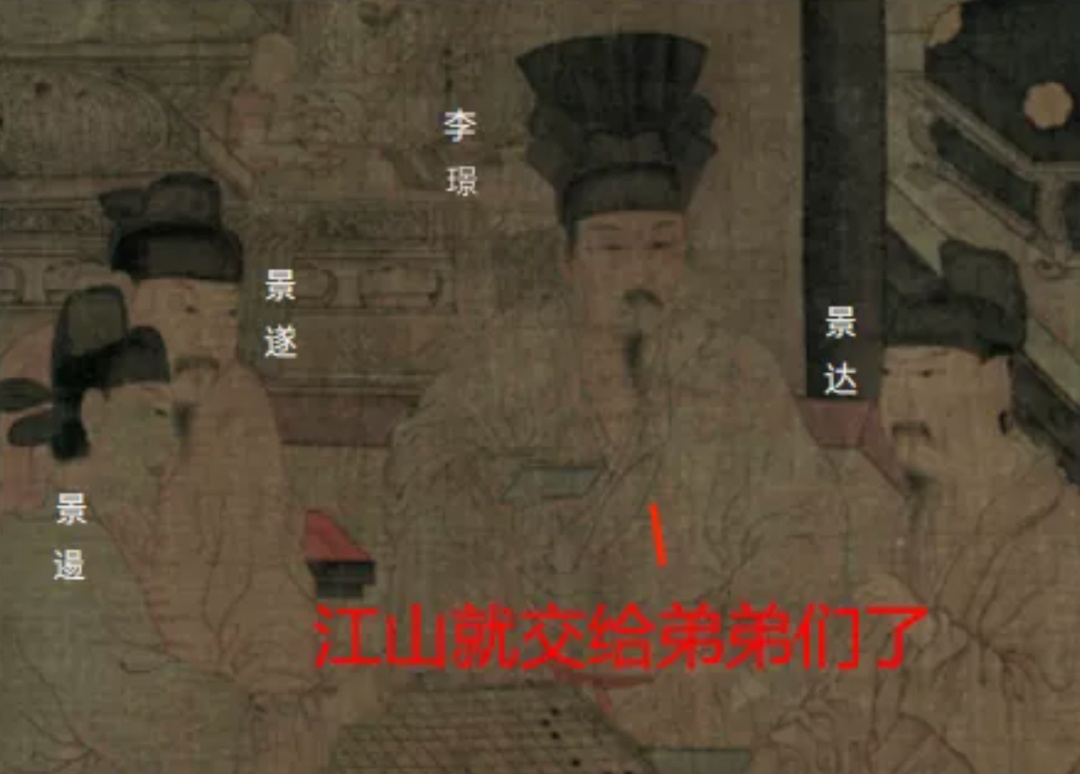 (画中四人按座次顺序分别为李璟和他的三个弟弟,以棋盘上的北星图暗示帝位的相传)