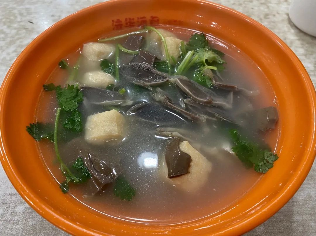 汤包的“最佳拍档”就是店里的老鸭粉丝汤。汤头是每天现熬的,没有太多调料味,汤色呈乳白色,鲜味十足。汤里的料也很足,鸭胗、鸭肠、鸭血、油豆腐满满地铺在粉丝上,还放了香菜提鲜(不吃香菜的话,可以提前和店家说明哦),一碗下肚,从喉咙到胃都舒服了。